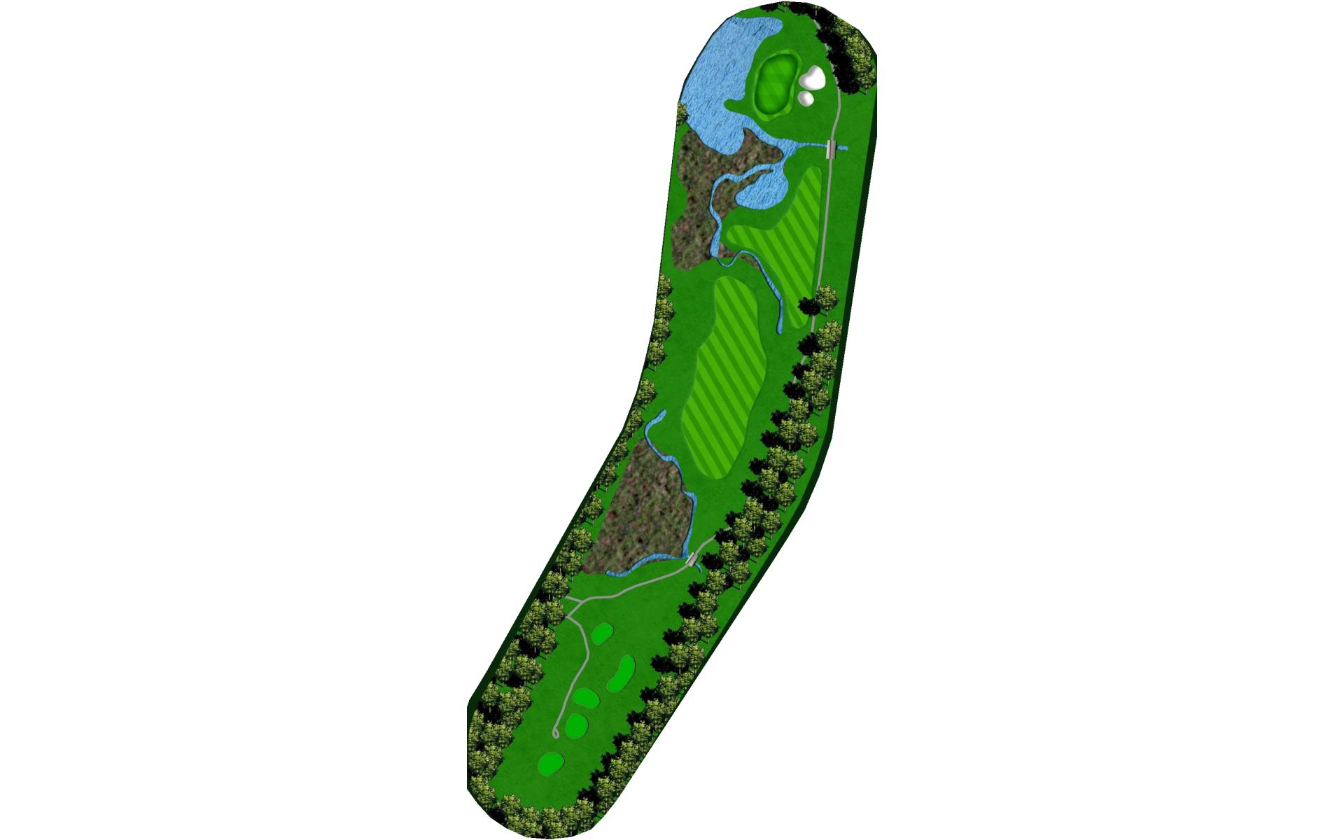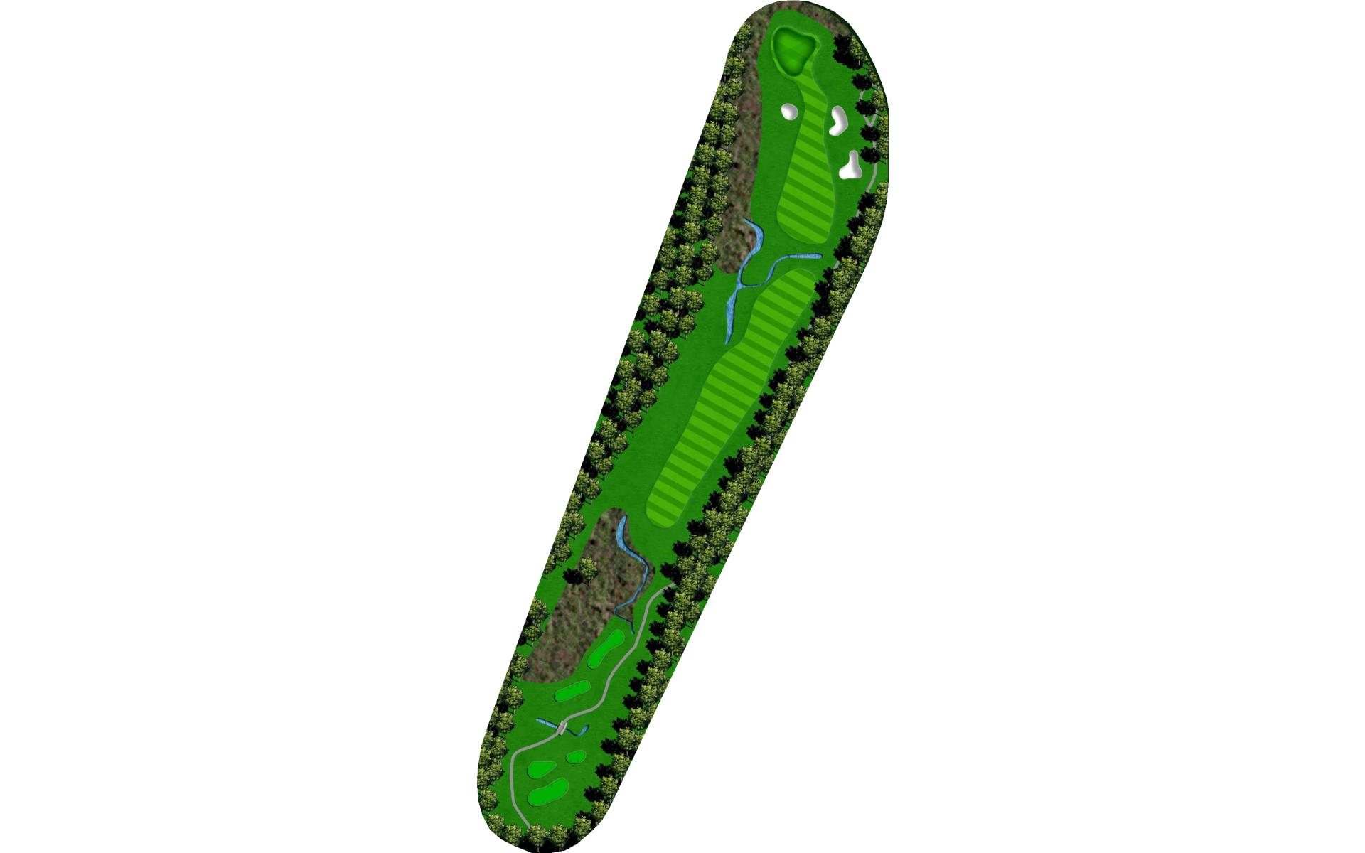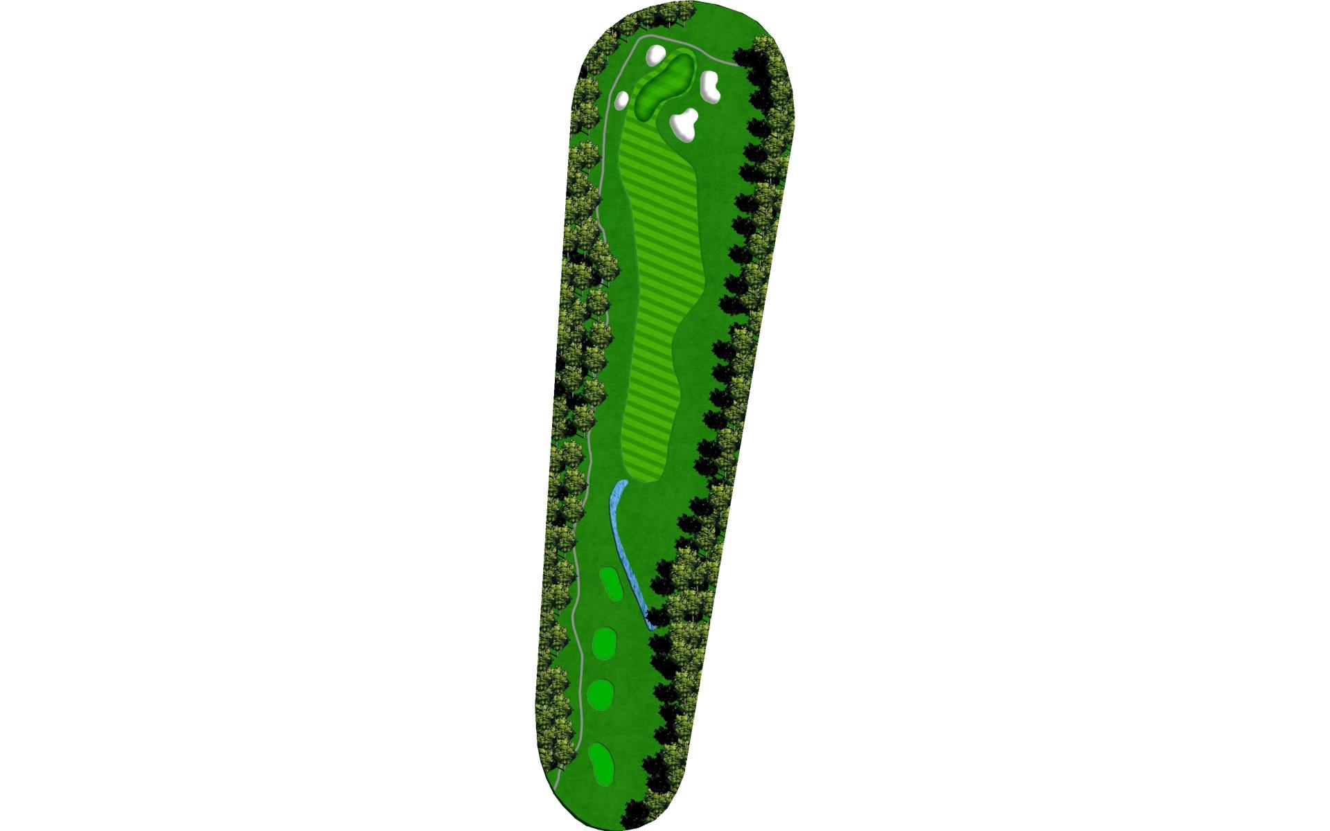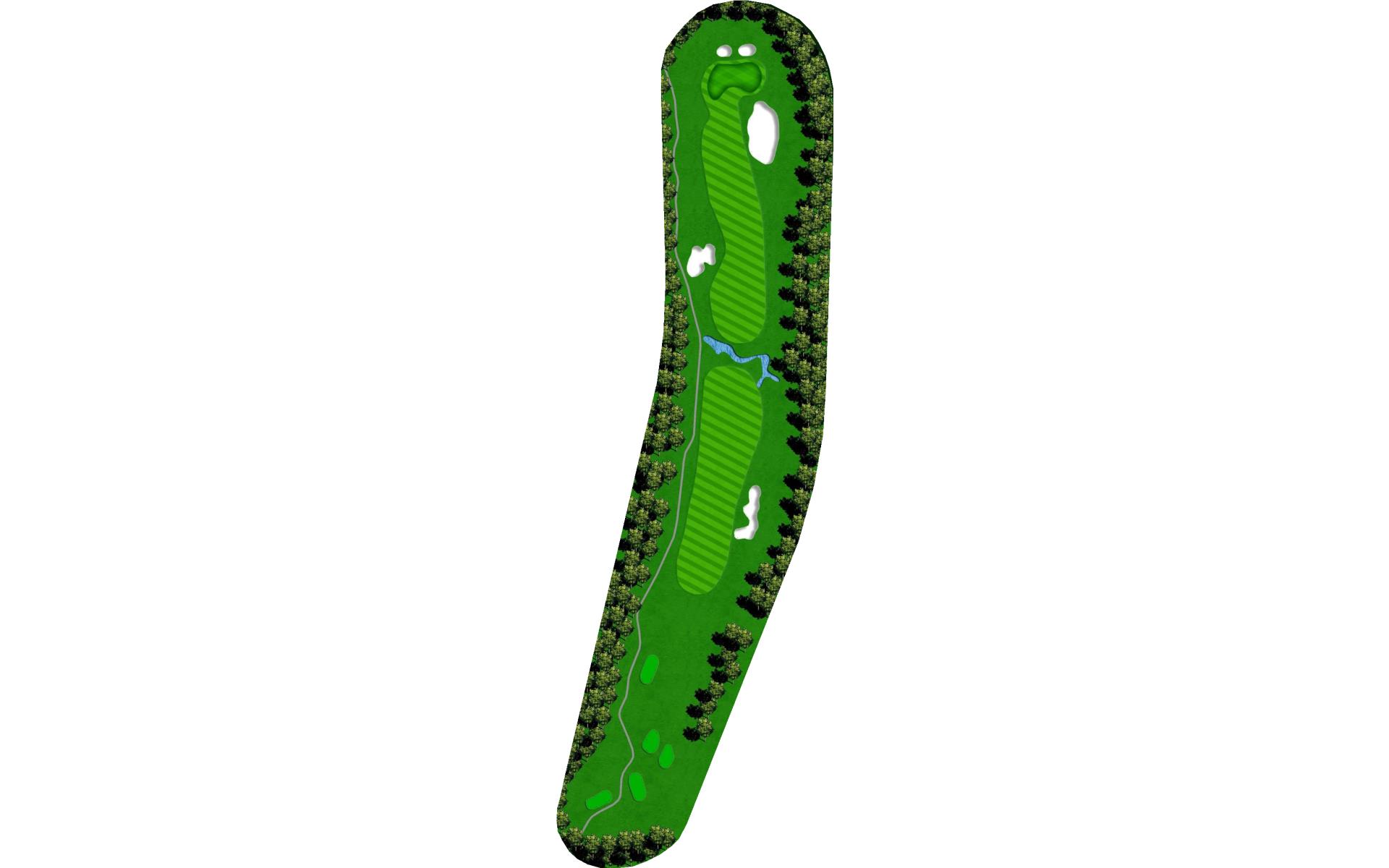 This slight dogleg left par 5 is a three-shot hole for most players. A tee shot in the fairway will be needed to safely navigate the water hazard running through the fairway on your second shot.
