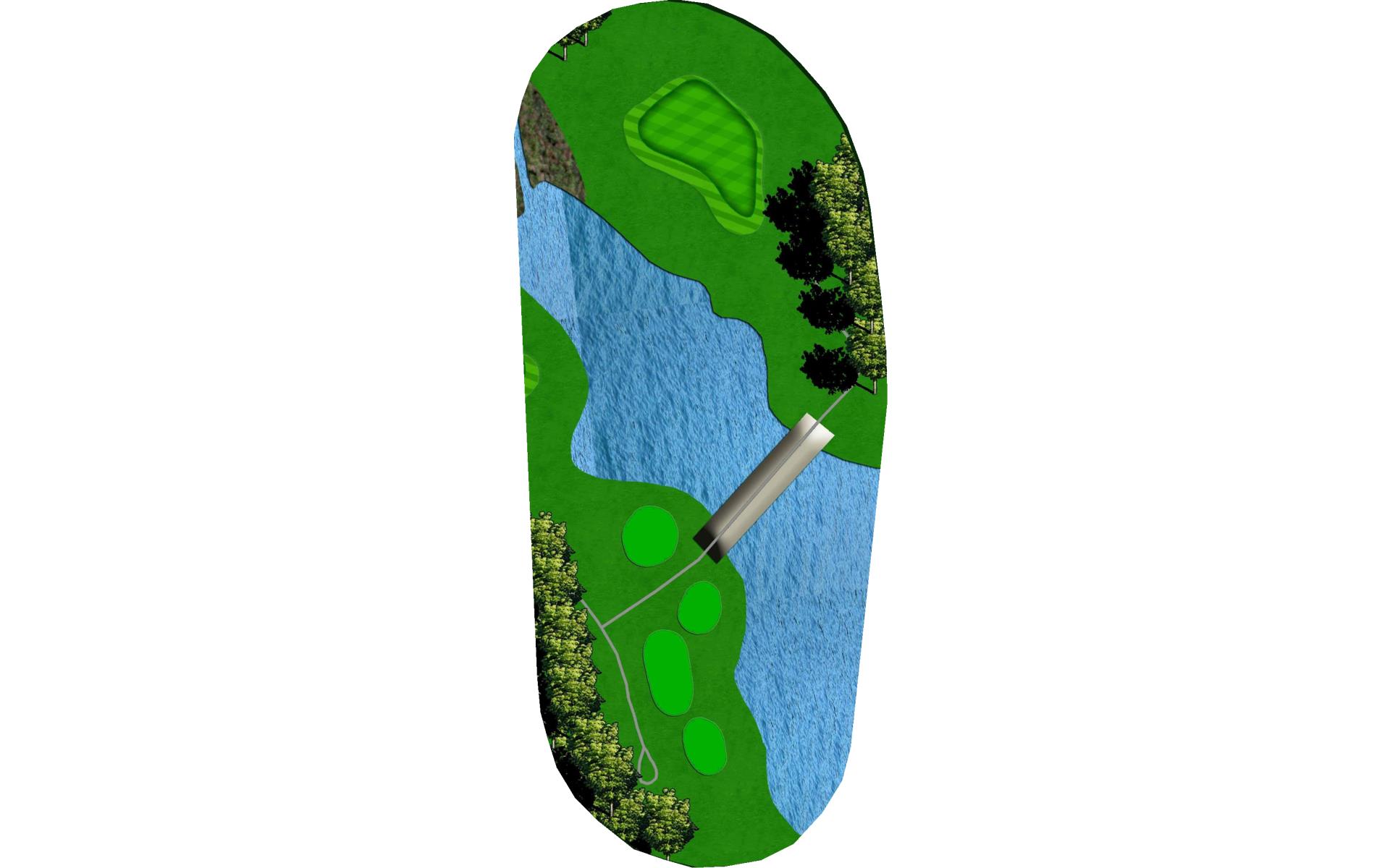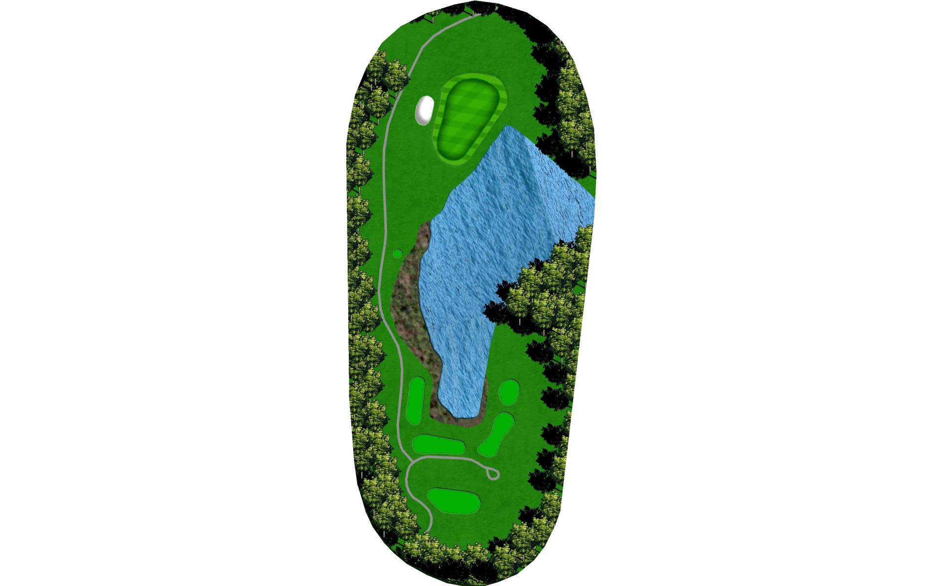 This challenging par 4 is the signature hole on the course. An elevated tee shot over a water hazard will leave you a short-mid iron approach shot to a green protected by water on the front & left with bunkers on the right. Favor the left side with your tee shot for the best angle into a green that slopes towards the water.