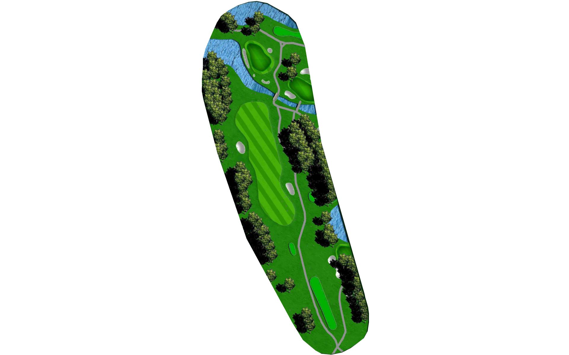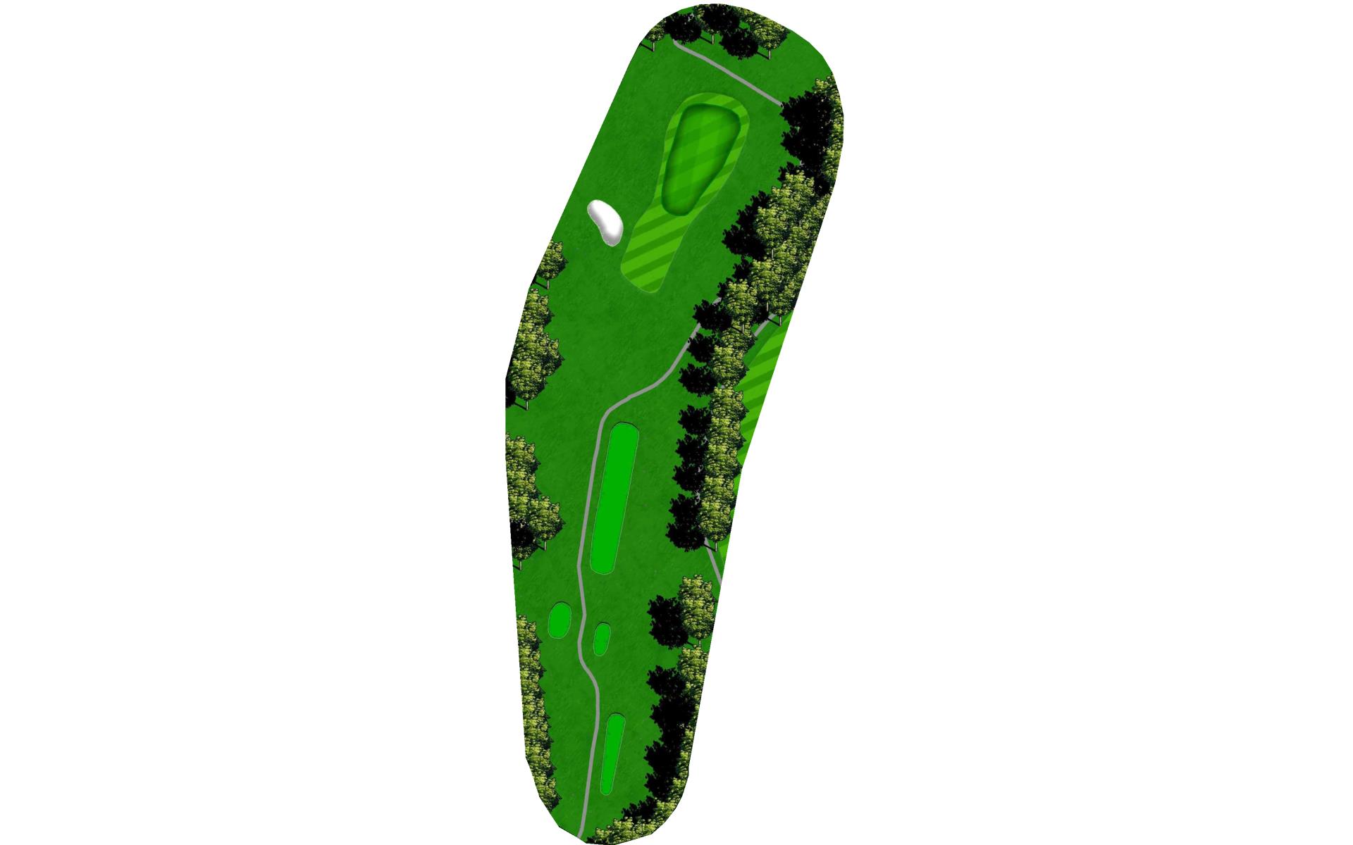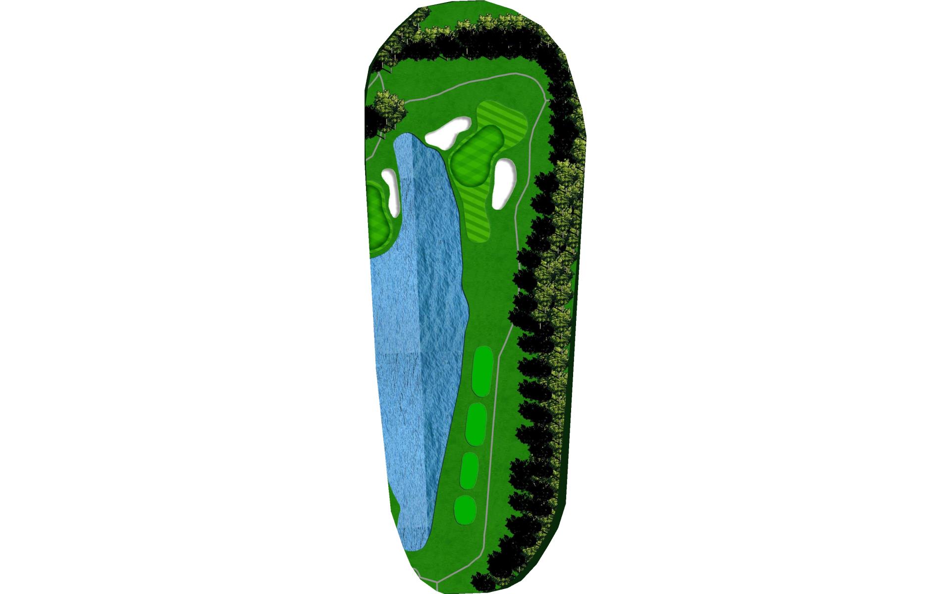 The tee shot needs to be on the left to avoid the water, aiming for the Hilliard Water Tower. All kinds of trouble in all kinds of places present many different strategies. All in all, the green is large and severe. Any two putt is good here.