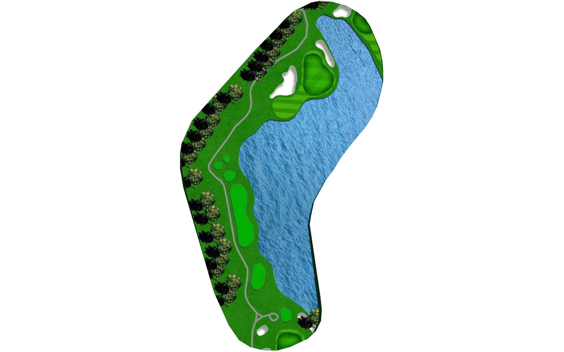 Two fine long shots can reach the green. The challenge of this hole is whether or not one should go for a green that is a peninsula. Although the green is ample, it is surrounded on three sides by water and sand and has a little keyhole pot bunker that protects the only opening to the green. Blind faith and great courage will be needed to navigate this treacherous par 5 green.