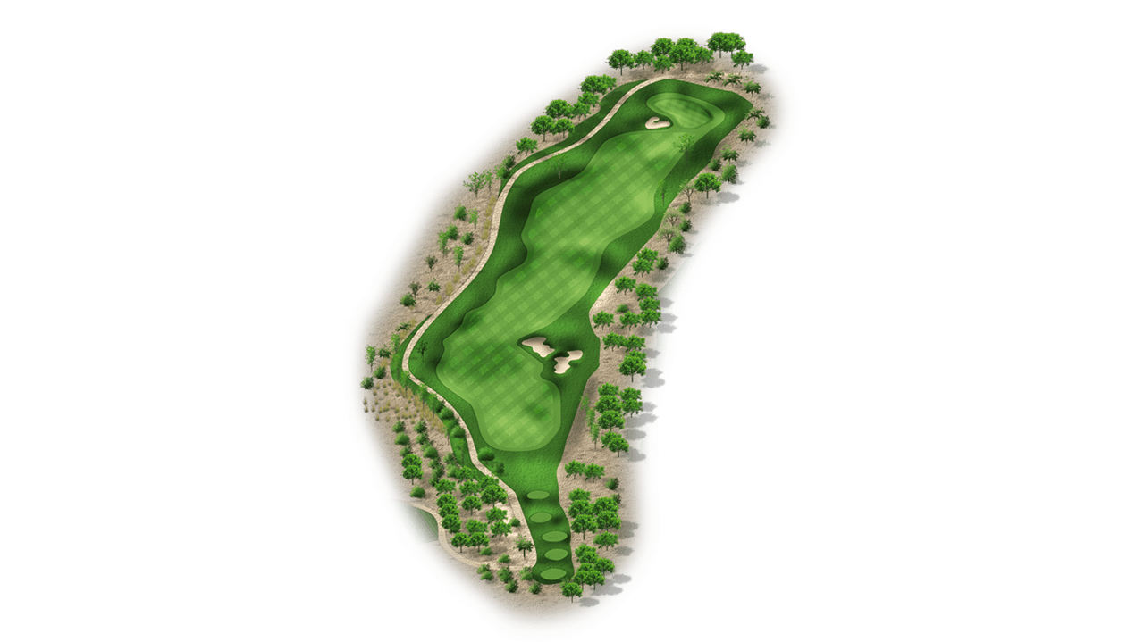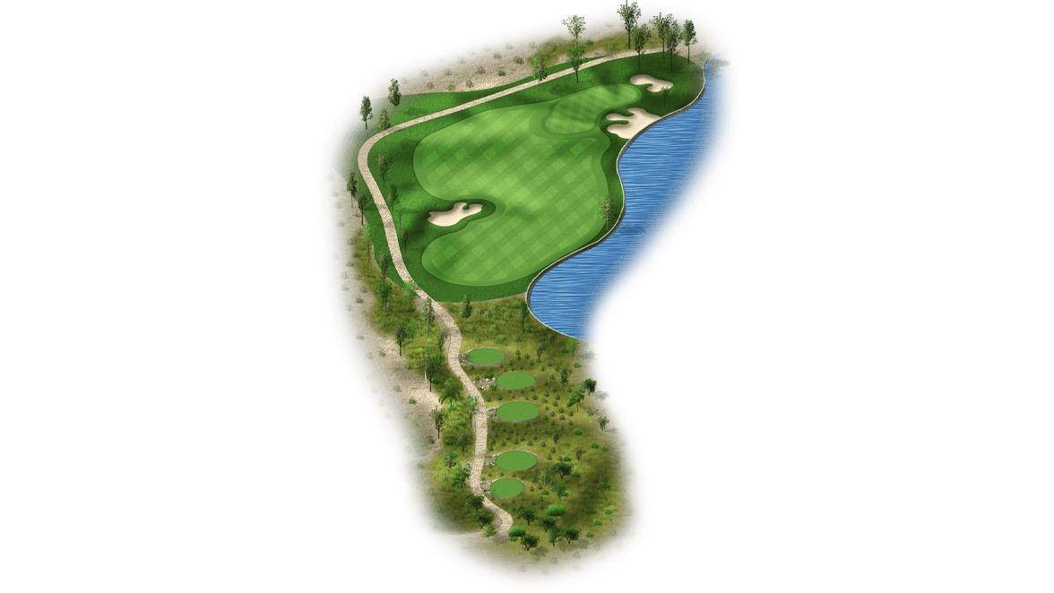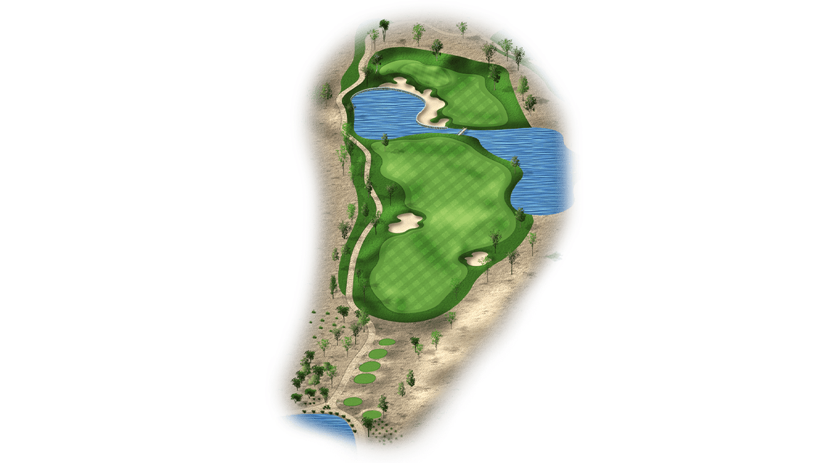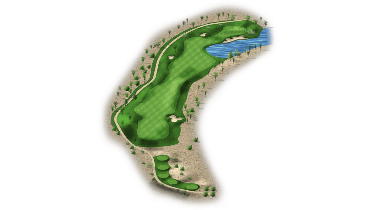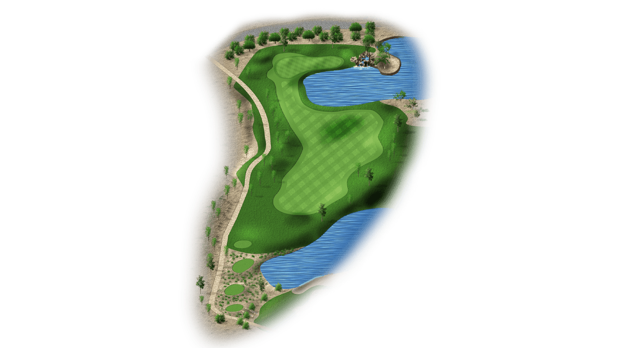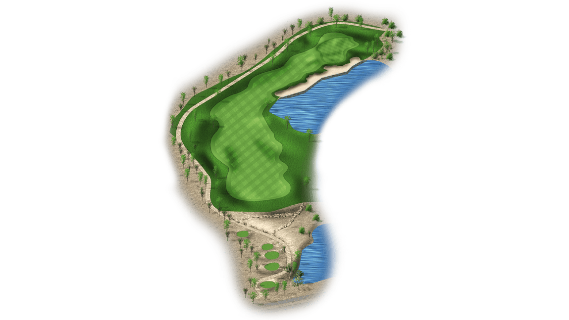 | This risk-reward hole is a drivable par 4 that’s protected by water on the right side. Players who lay-up will have a wedge into the green and will only have to avoid the bunker on the left side of the fairway. The green itself is also protected by bunkers on the right side. |
