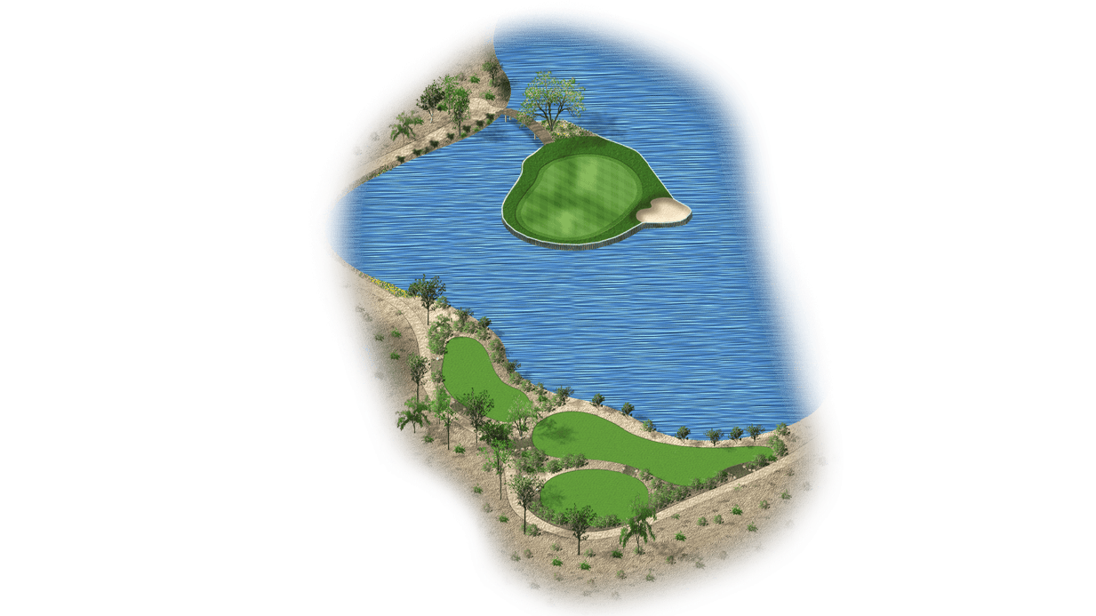 | The par 3 seventeenth is the signature hole at Seville. With its island green, player’s distance control will be tested. A bunker on the right side adds to the challenge of this hole. |
